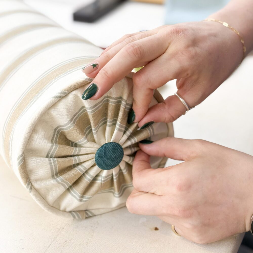 - A bolster cushion with starburst ends, and piping and button detail, incorporating a concealed zip.